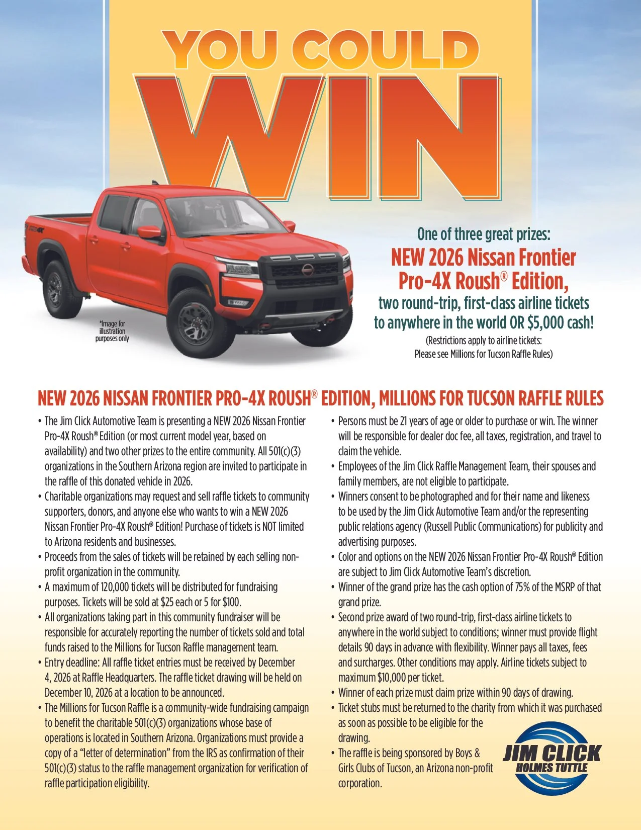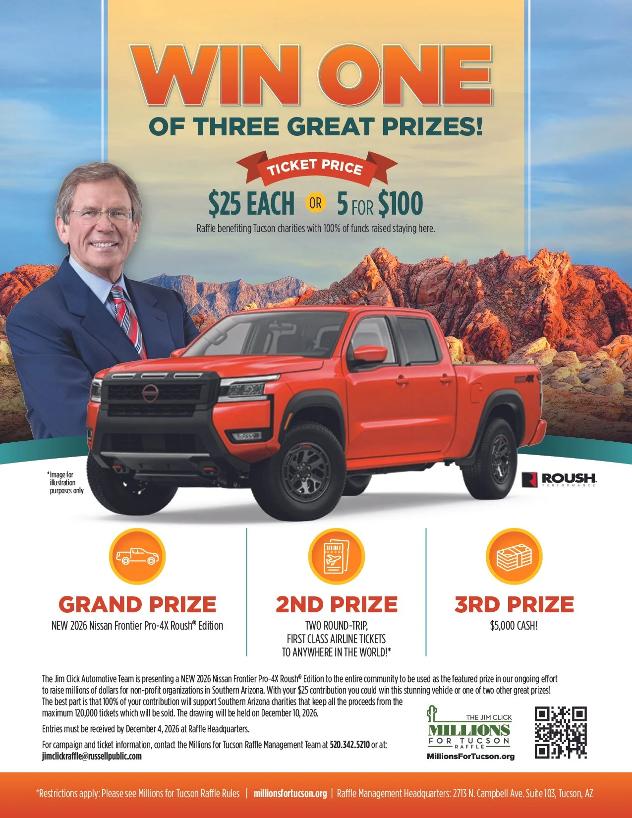 This year Jim Click is donating a 2026 Nissan Frontier Pro-4X Roush® Edition as the Grand Prize in this year’s raffle! Second prize is two round-trip, first-class airline tickets to anywhere in the world (some restrictions apply) and third prize is $5,000 in cash! Tickets can be purchased only from participating charities at $25 each or 5 for $100.